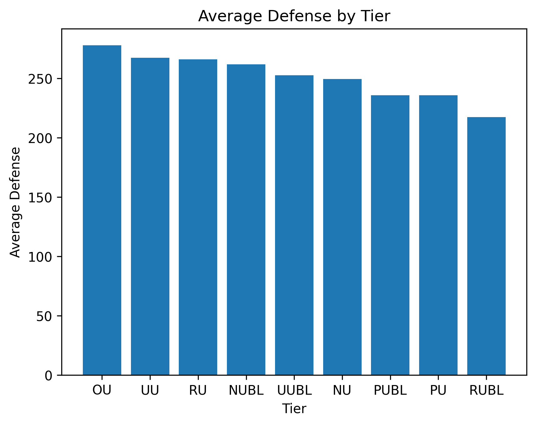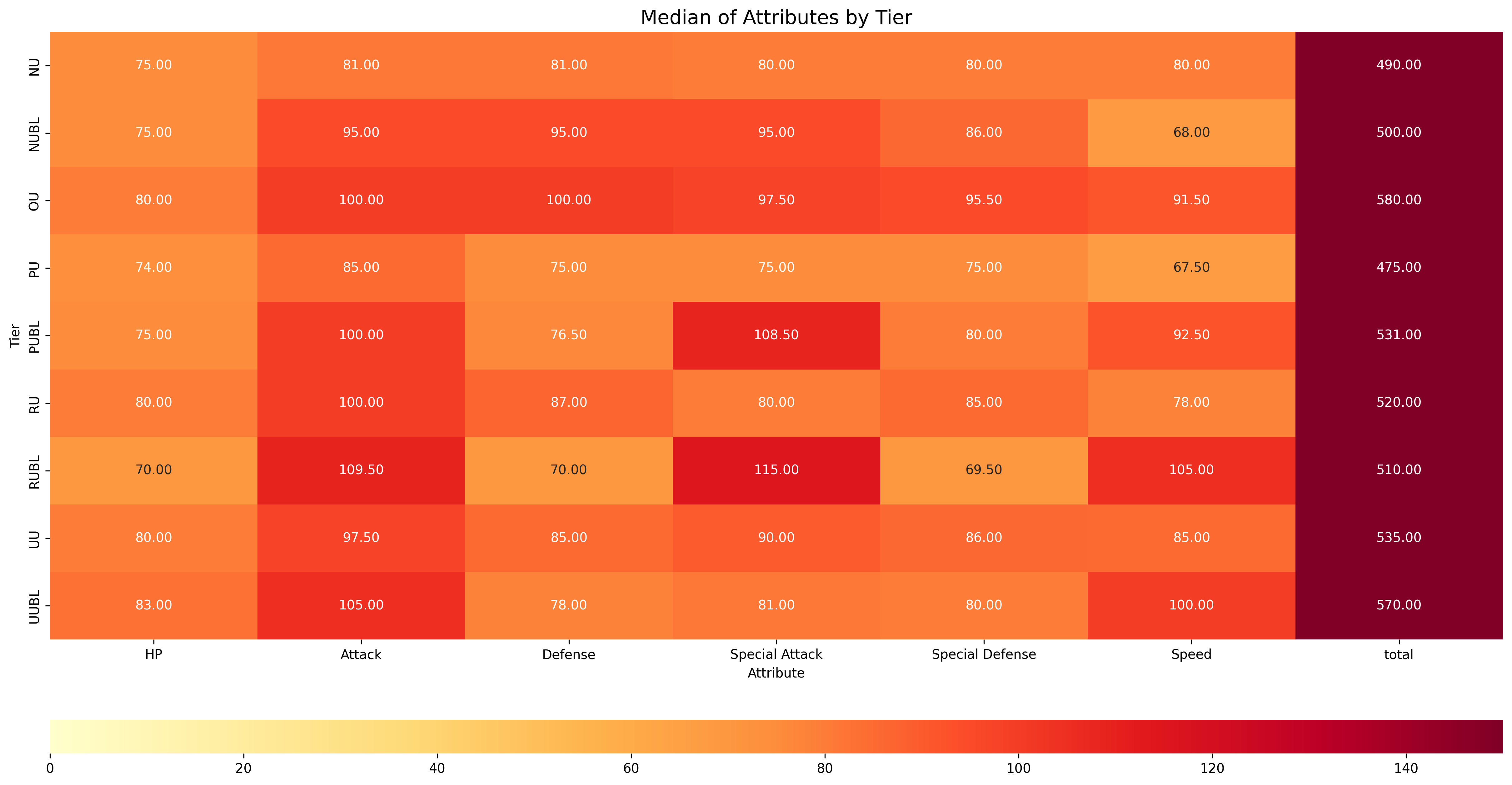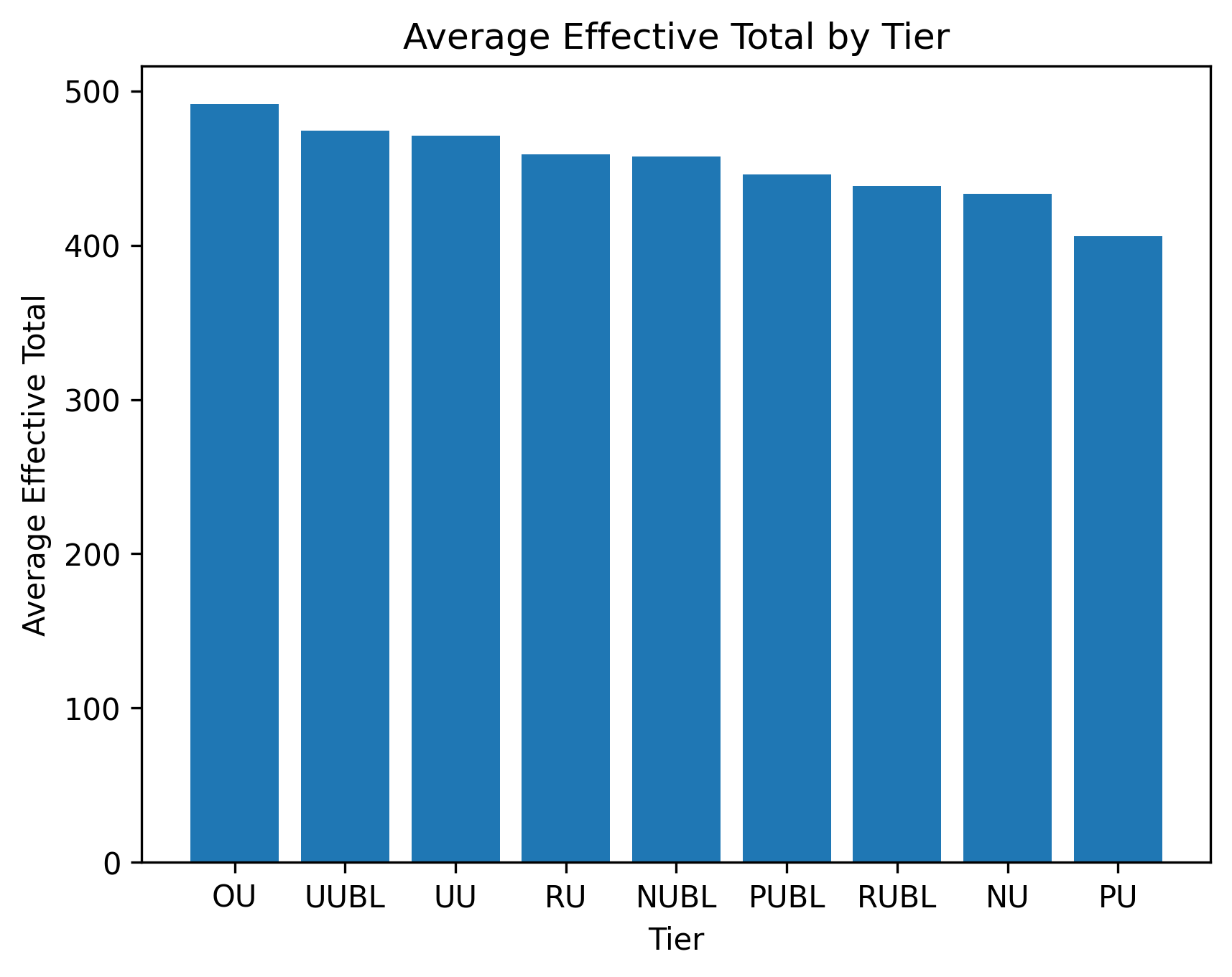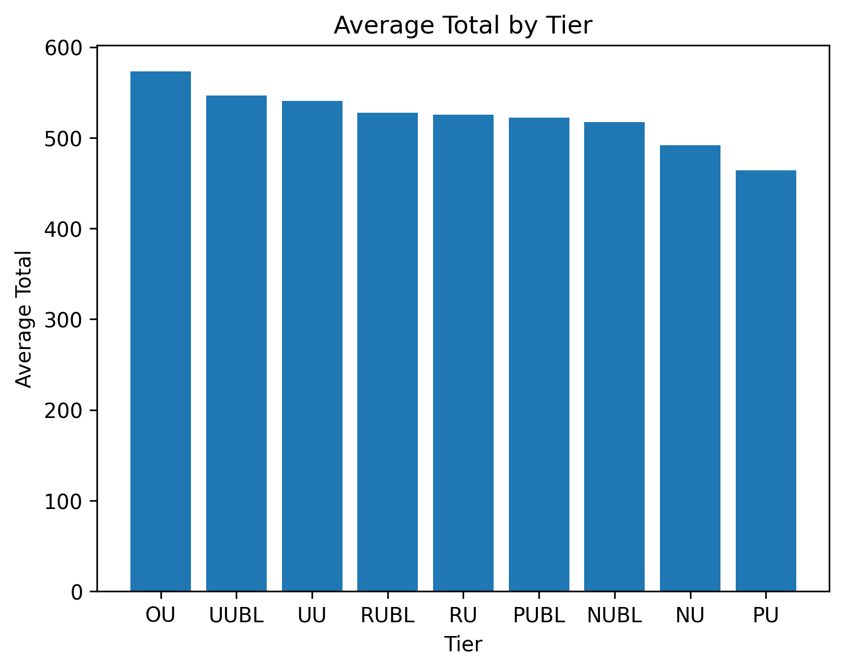 It is not easy to see any details from the general information above. Actually, in order to judge whether a pokemon is useful in battles, we believe that a pokemon that is used more frequently is more useful. This is what the Tier stands for. The Tier of pokemons consists of values: ‘Uber’, ‘RU’, ‘OU’, ‘UUBL’,’UU’,’RUBL’, ‘RU’, ‘NUBL’, ‘NU’,’PUBL’, ‘PU’ and ‘LC’. Since ‘Uber’ represents the pokemons that are banned using and ‘LC’ represents the pokemons that are too weak to be taken into account when players are arranging their teams, we only use the left tiers. Therefore, the left ones are ‘OU’, ‘UUBL’,’UU’,’RUBL’, ‘RU’,’NUBL’, ‘NU’,’PUBL’ and’PU’, where ‘OU’ represents the most frequently used ones and ‘PU’ the least. Then, it is common to believe the total of 6 basic natures reveals a pokemon’s power. A higher of total number is, a stronger pokemon is revealed. Therefore, we want to visualize the relation between Tier and the total as follows. We can see it almost meets our expectations.