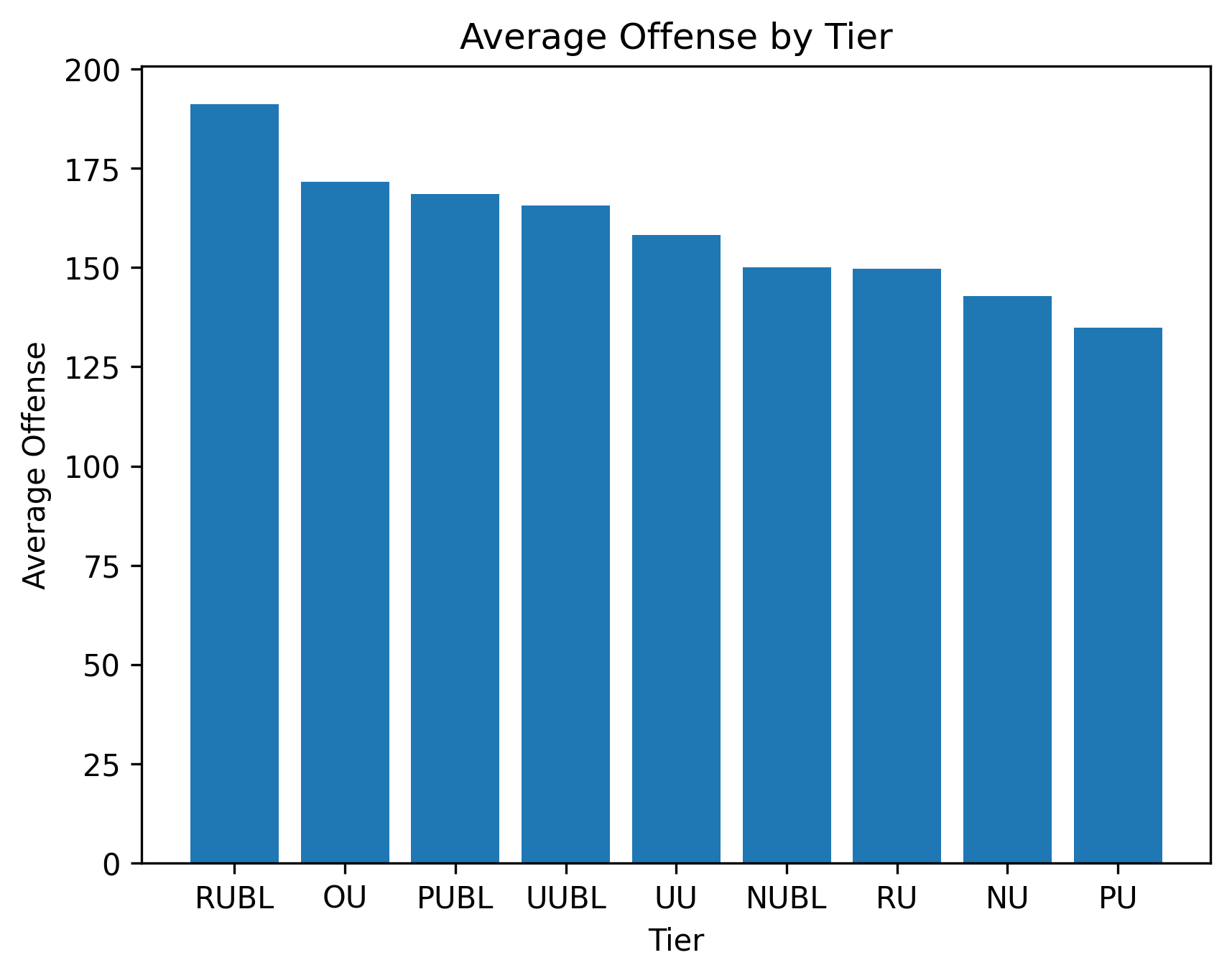 It is not easy to see any details from the general information above. Actually, in order to judge whether a pokemon is useful in battles, we believe that a pokemon that is used more frequently is more useful. This is what the Tier stands for. The Tier of pokemons consists of values: ‘Uber’, ‘RU’, ‘OU’, ‘UUBL’,’UU’,’RUBL’, ‘RU’, ‘NUBL’, ‘NU’,’PUBL’, ‘PU’ and ‘LC’. Since ‘Uber’ represents the pokemons that are banned using and ‘LC’ represents the pokemons that are too weak to be taken into account when players are arranging their teams, we only use the left tiers. Therefore, the left ones are ‘OU’, ‘UUBL’,’UU’,’RUBL’, ‘RU’,’NUBL’, ‘NU’,’PUBL’ and’PU’, where ‘OU’ represents the most frequently used ones and ‘PU’ the least. Then, it is common to believe the total of 6 basic natures reveals a pokemon’s power. A higher of total number is, a stronger pokemon is revealed. Therefore, we want to visualize the relation between Tier and the total as follows. We can see it almost meets our expectations.